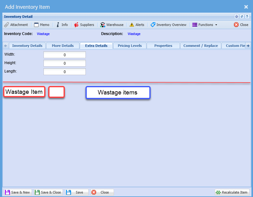 Button will open up a new window that shows wastage items linked to main item