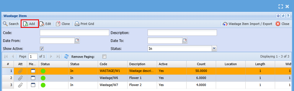 When selecting wastage onto a document, wastage looks at all wastage marked as In.