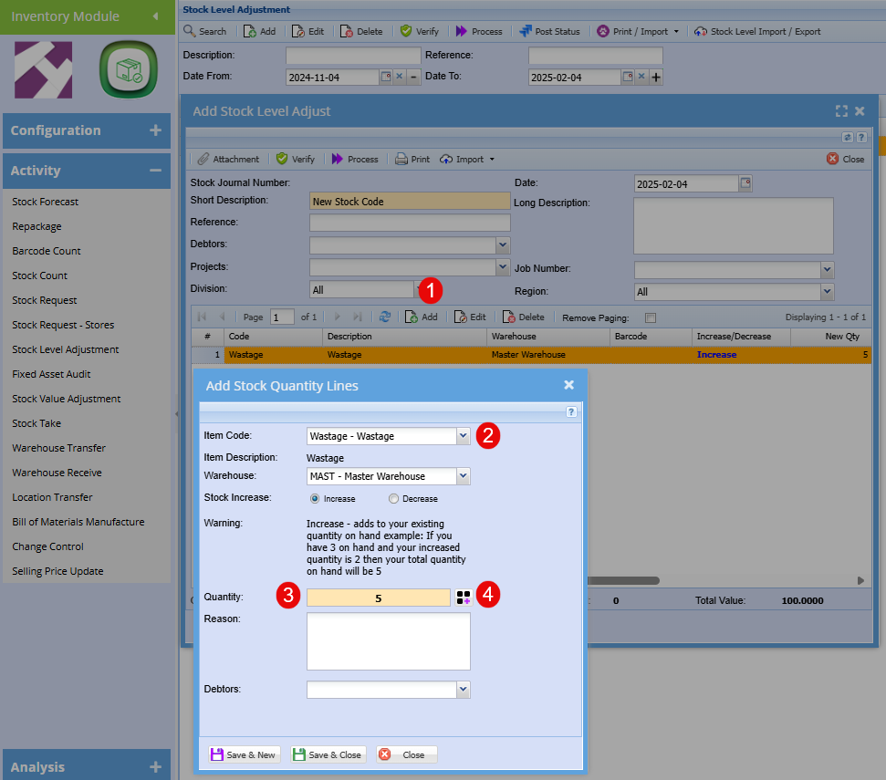 Wastage Stock Level Adjustment and Adding New Wastage Item