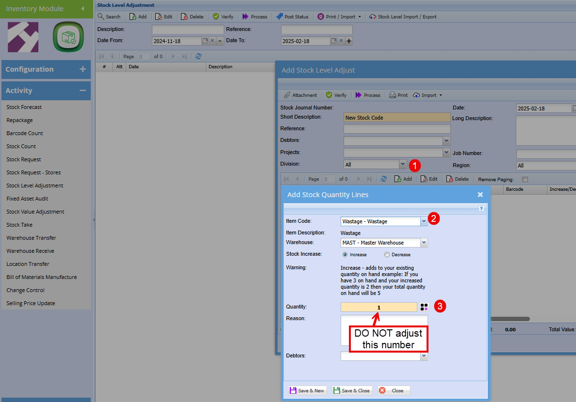 Wastage Stock Level Adjustment and Adding New Wastage Item