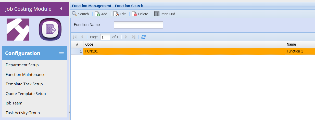 Search button: the search function will return Function Management Item records based on the search criteria entered