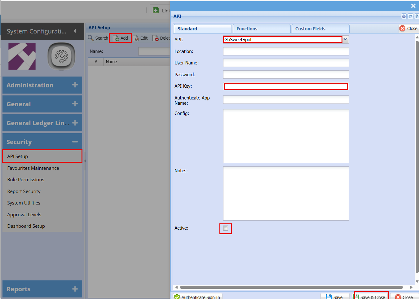 Get the API Key from the GoSweetSpot account page in Administraton; Preferences & Settings; Advanced Settings; API Key [TODO screenshot]