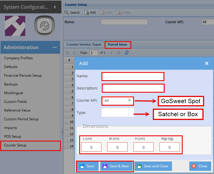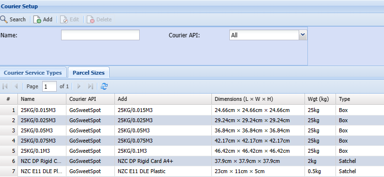 - Go to the Courier Setup search grid in SCM User actions: SCM; Administration; Courier Setup; Parcel Sizes