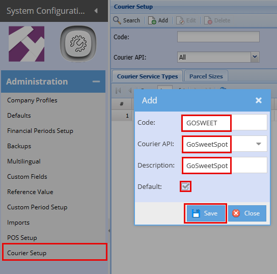 1. Search in SCM; Administration; Courier Setup; Click Add; Add Code, Courier API, Select GoSweetSpot; Add description, Click Default, Save