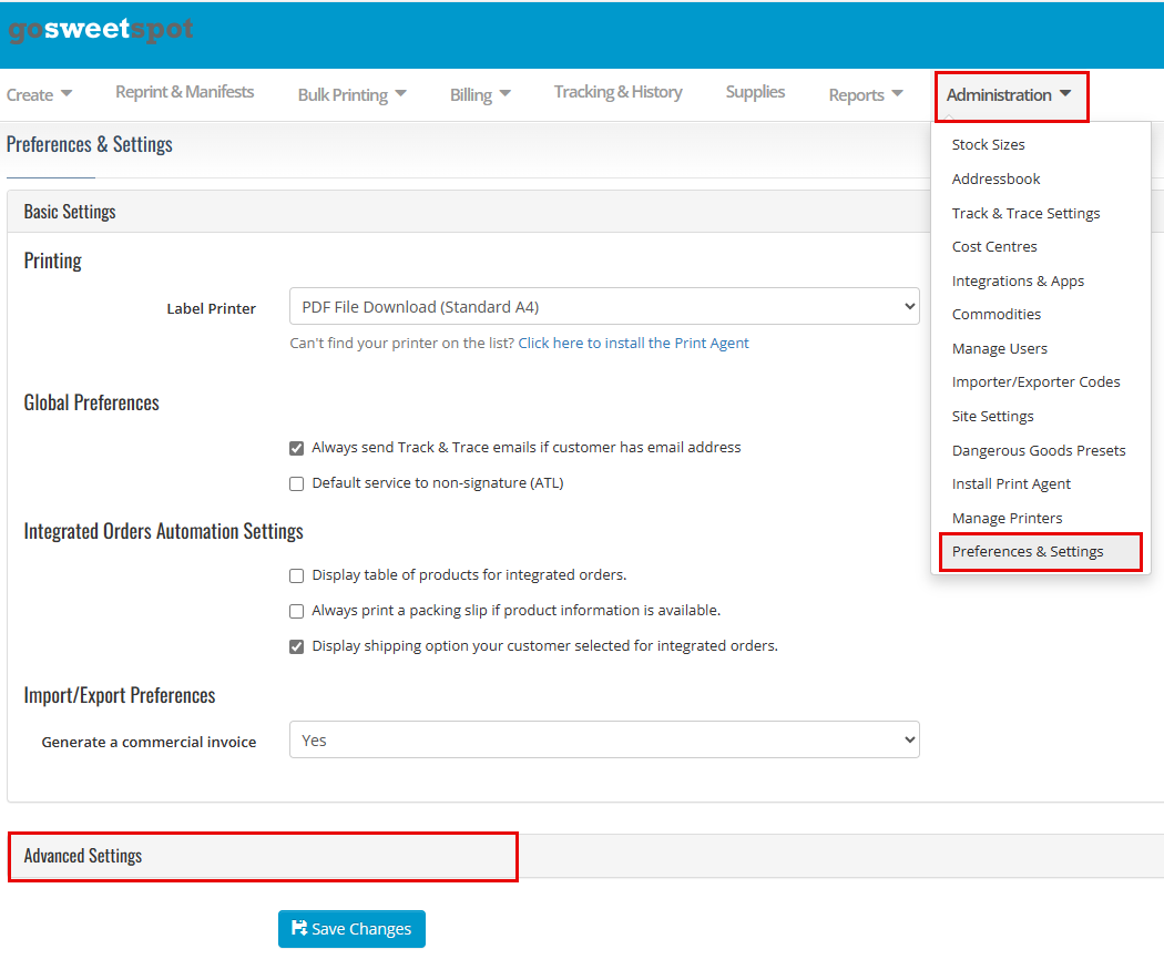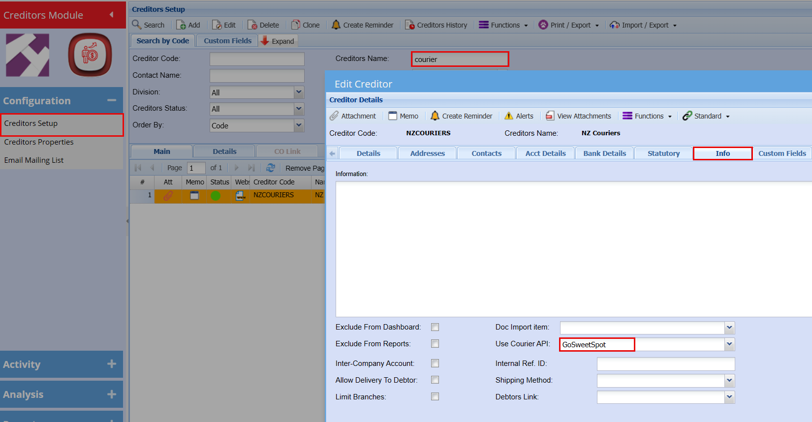 In the Info Tab select "GoSweetSpot" in the Use Courier API combo box field.
