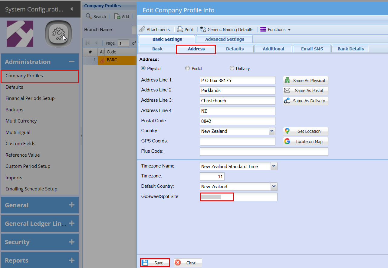 1. Company Profile: Search in SCM; Administration; Company Profile; double click to edit Company Profile; Address; Add Site No. to GoSweetSpot field; Save