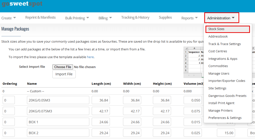 GoSweetSpot allows pre-defined parcel sizes to be referenced in new shipments.