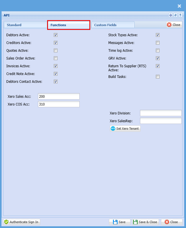 | Set Xero Tenant | Once you have Authenticated your Debtors, Creditors and Inventory, you will need to set the Xero Tenant which is a once off setup. |