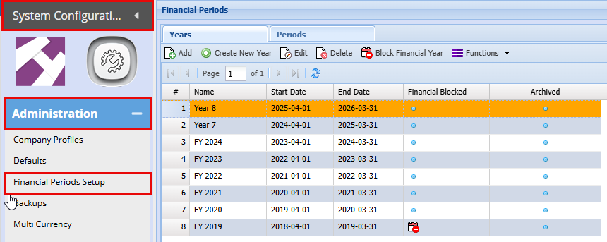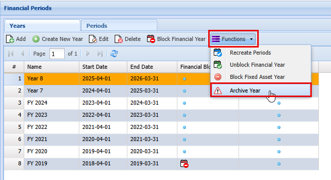 A financial year cannot be archived unless the preceding year has already been archived, and you will not be able to archive any year that has not been fully closed off and blocked.