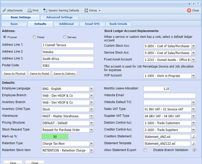 Tax Type - The tax type selected here for the branch will mean that when new inventory items are created the default tax type will be the one selected.