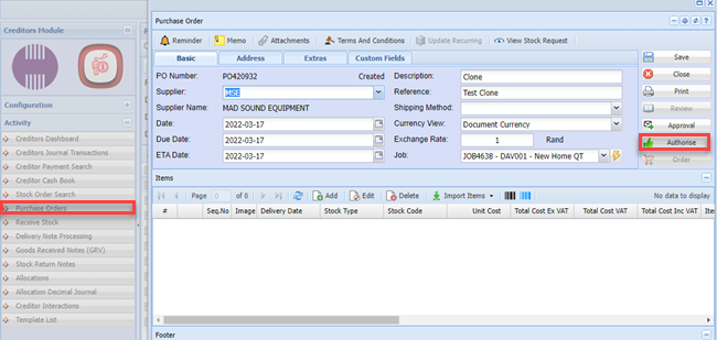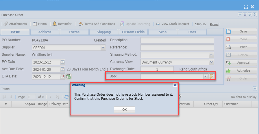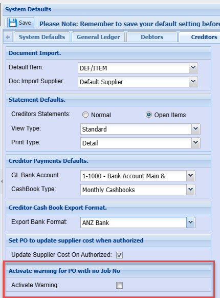 Activate a warning in Purchase Order save when Purchase Order does not have a Job number allocated.