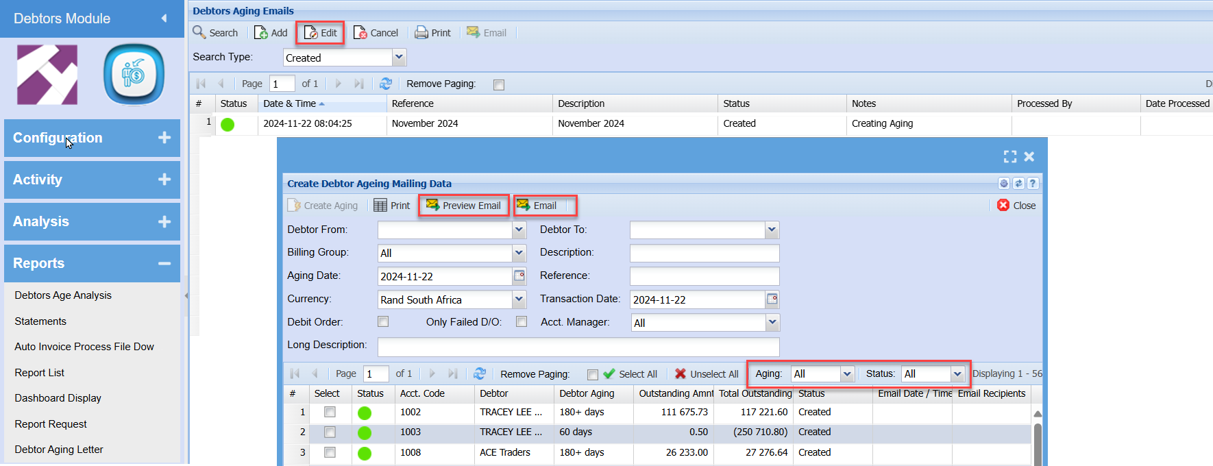 Select the newly created entry and then click on the Edit button. A window will appear displaying all the Debtor Aging Entries