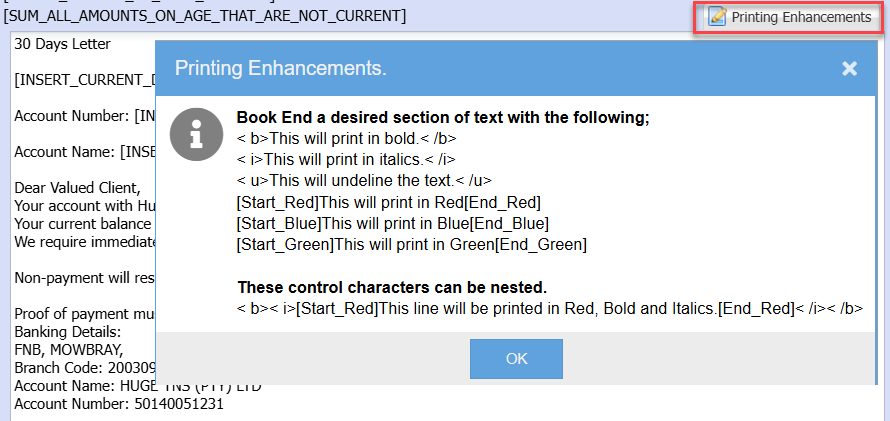 When preparing the various letters the Printing Enhancements can be included into the body of the letter to emphasise pertinent points in the letter.