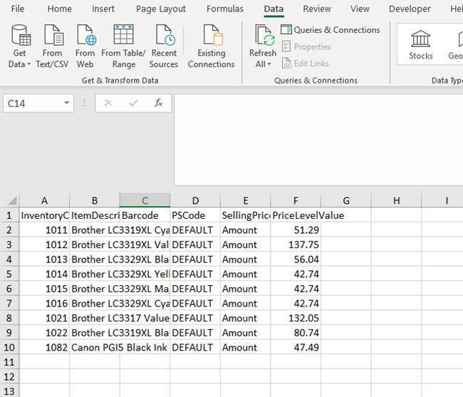 Export the pricing levels once the file is in Excel, remove the headers so you have the stock code at the top of the first row