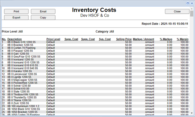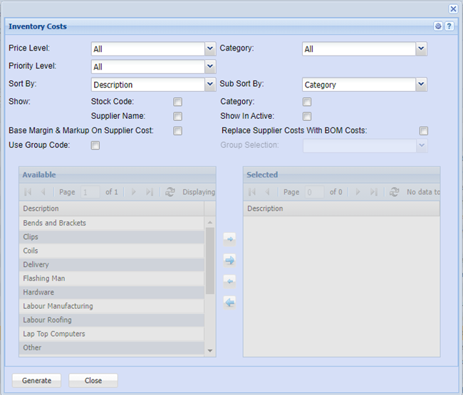 Select the inventory costs report under the inventory category. Ensure you have the price levels selected as ALL so that you select all your price level categories. Click on the “Generate Report”