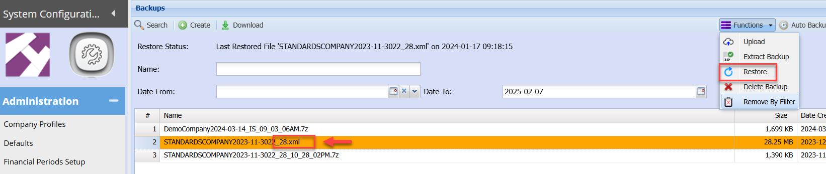 To restore a backup of your company, there are two steps: