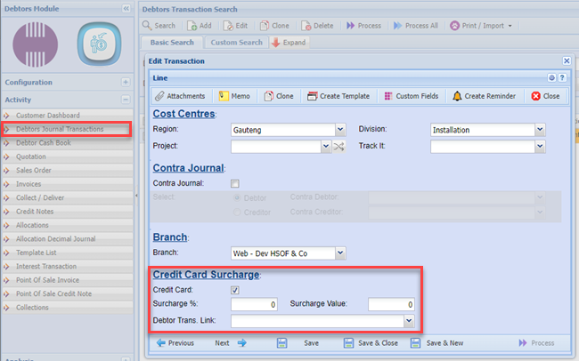 Credit card surcharge is used in the debtors / customer transaction journal.