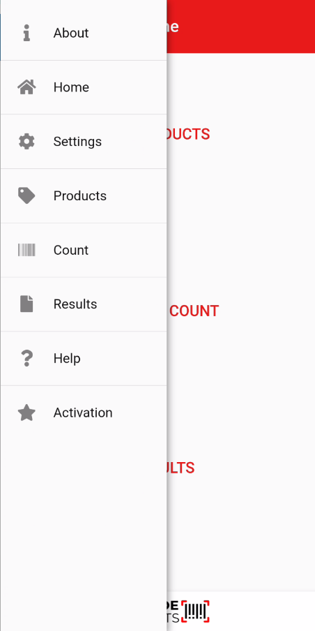 | Home | Takes one back to the home page where Products, New Count and Result icons |