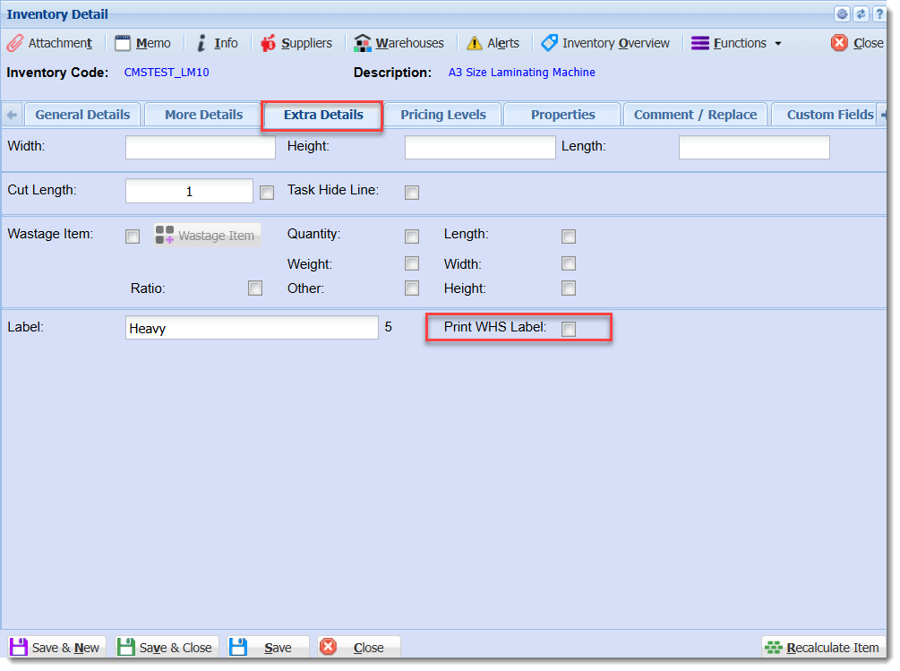 %WHSCODEPRN%and%WHSNAMEPRN%will have no effect unless the Inventory Item has the option "Print WHS Label" enabled in its setup form and there is at least one Warehouse with the option "Print On Label" enabled in its setup form, as shown.