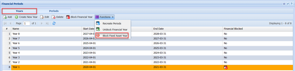 To aid in blocking previous year’s Fixed Asset Periods. Select the Year on the Year Tab then click on the Block Fixed Asset Year to block an entire year.