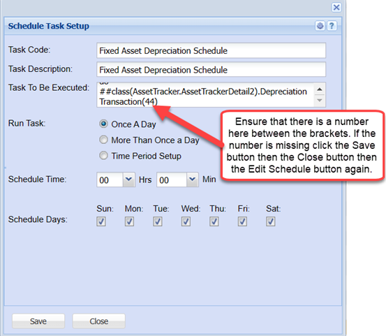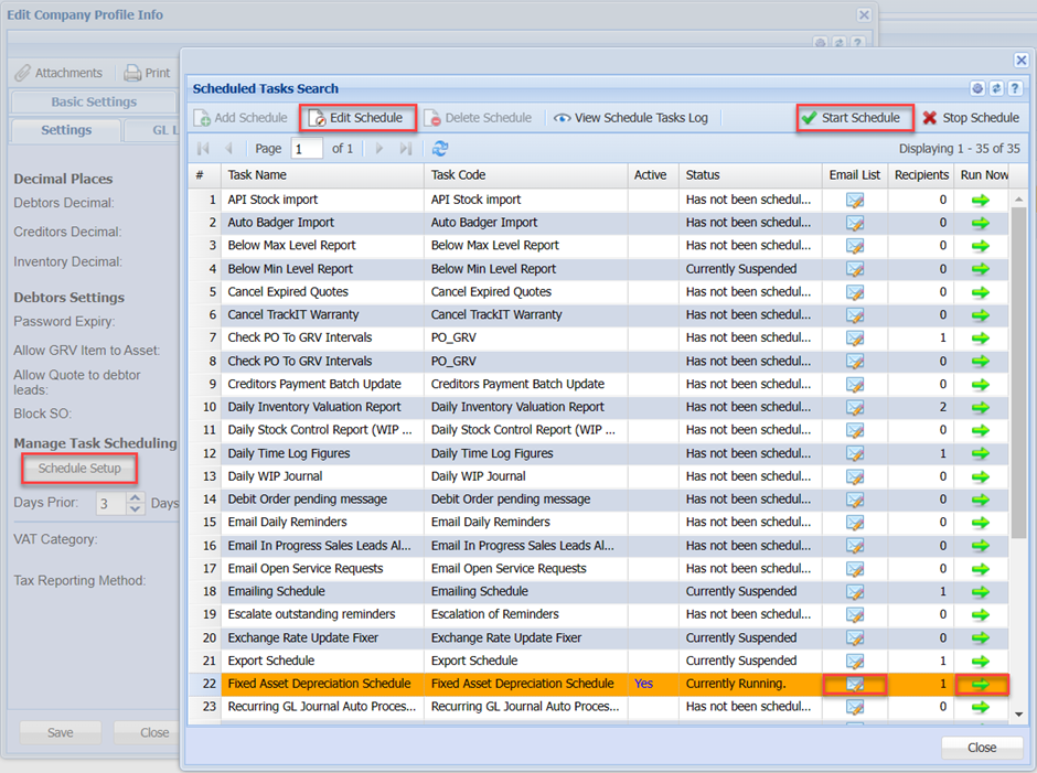 To run the Schedule manually select the Fixed Asset Depreciation Schedule entry and then click on the green arrow icon.