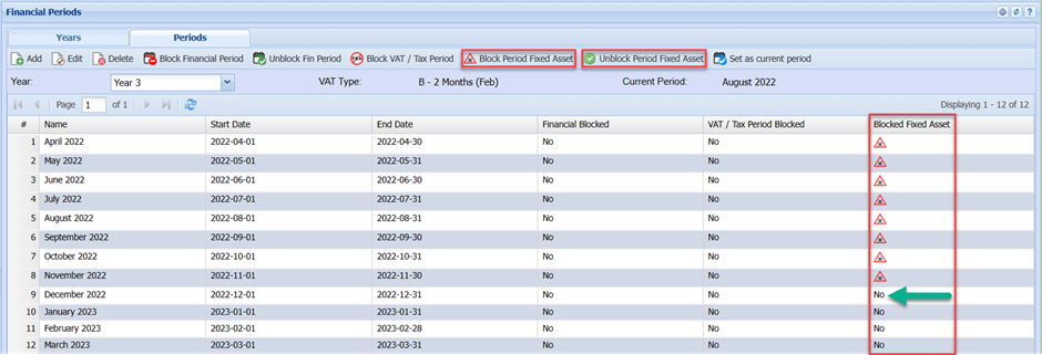 Select the period and then click the Block Period Fixed Asset. The system works as follows, when the Fixed Asset Depreciation Schedule runs the system will search for the first unblocked period the use the date for this period e.h 2022-12-01 to 2022-12-31 for the date range for calculating the depreciation amount for the Month/ Year for each fixed asset selected in the process. In the case of the first depreciation transaction, the system will calculate the number of days from the Brought Into Use Date to the end of the Month/Year and calculate the depreciation accordingly. As soon as the system detects a difference Blocked Fixed Asset period e.g. the month the system will calculate depreciation for all the selected Fixed Assets for the next month.