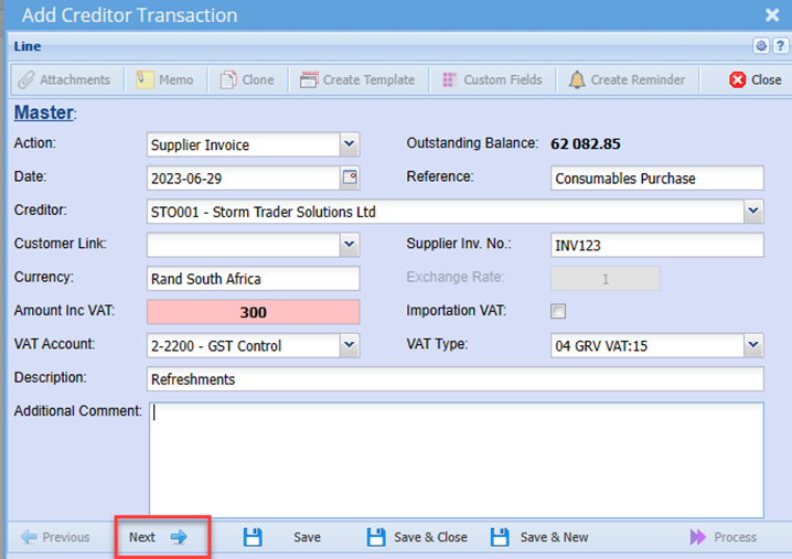 Select a Creditor: Short Search – just type in part of the code or name and hit enter on the keyboard and select the Debtor.