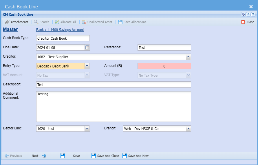 Add Creditors Cashbook