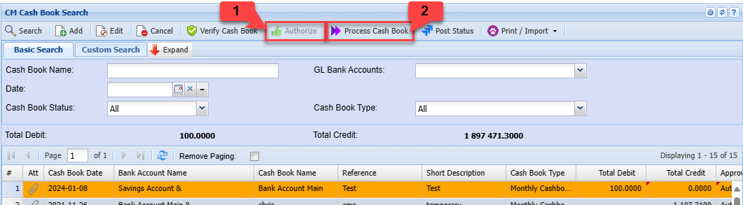 The cashbook can be authorized and processed