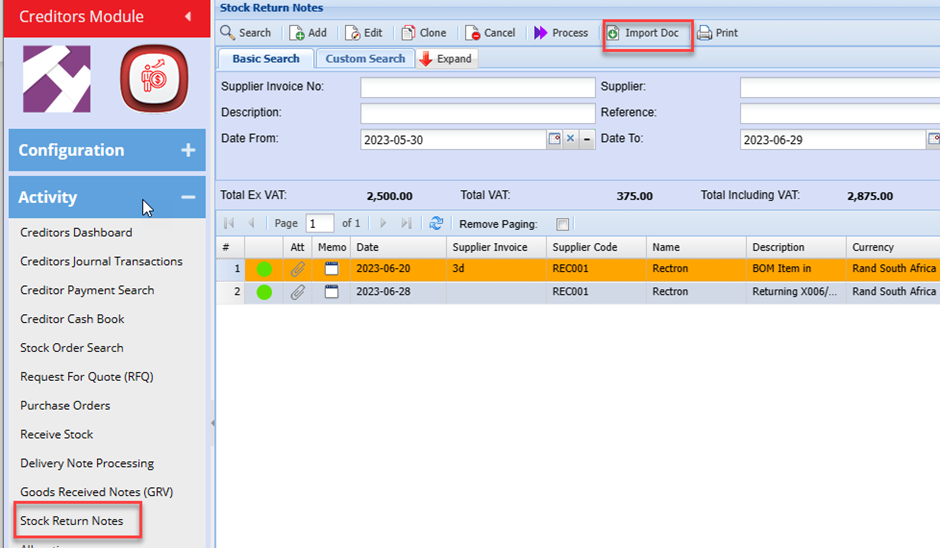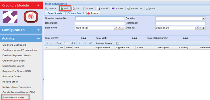 Creditors Module>Activity Menu>Stock Return Notes
