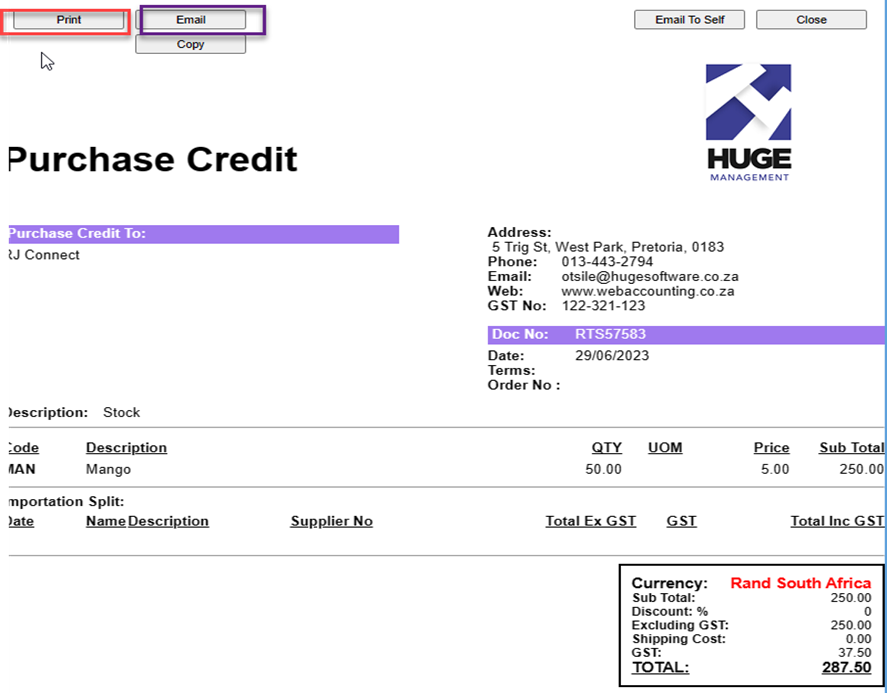 Process the Stock return note and Print/ email in the same manner as with manually capturing (see above)