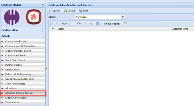 Creditors> Activity> Allocations Decimal Journal