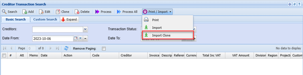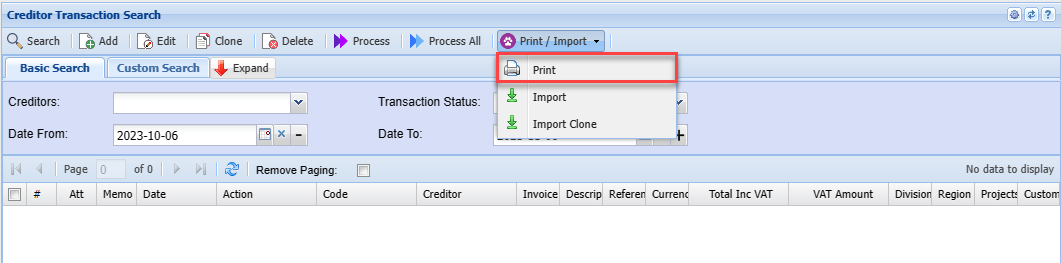 Creditors Journal Transaction Search