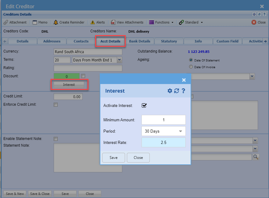 Creditors setup for interest