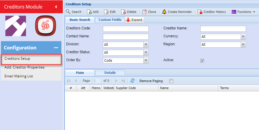 Search for the Creditor that you want to setup