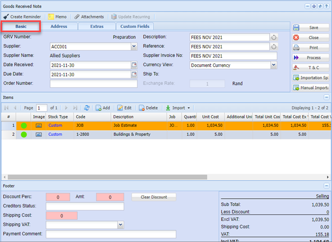 | Extra Tab | allows the user to view how the GRV was prepared from purchase order |