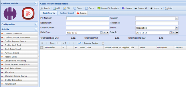 Creditors > Activity > Goods Received Note