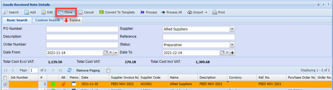 Goods Received Note (GRV) Search