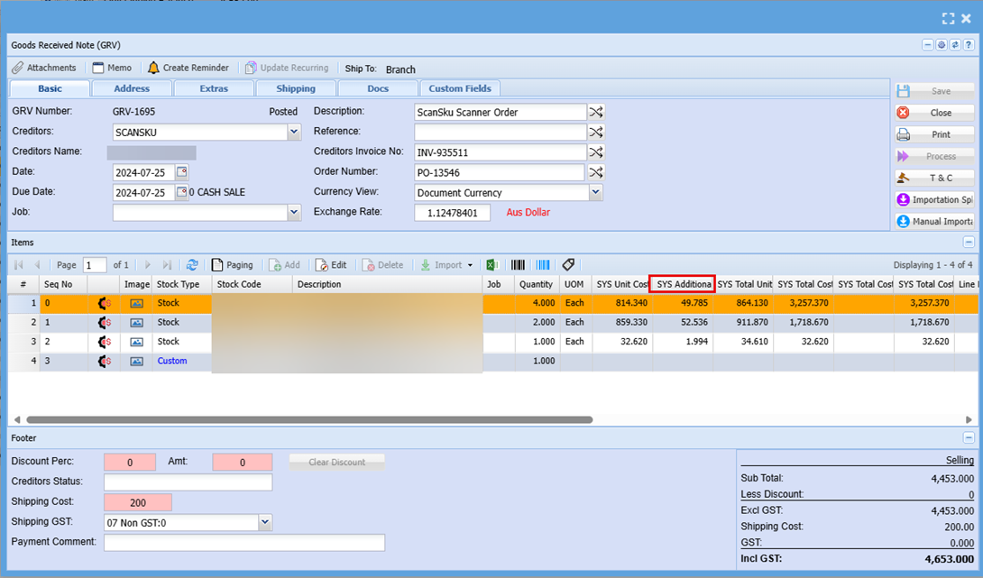 Once you have added your lines you can look back at the GRV Note and you will see the additional cost added to the landing cost of each stock item.