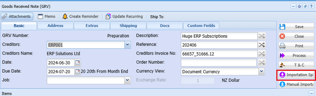 Click Importation Split Button found at the Top right of the Goods Received Note (GRV)