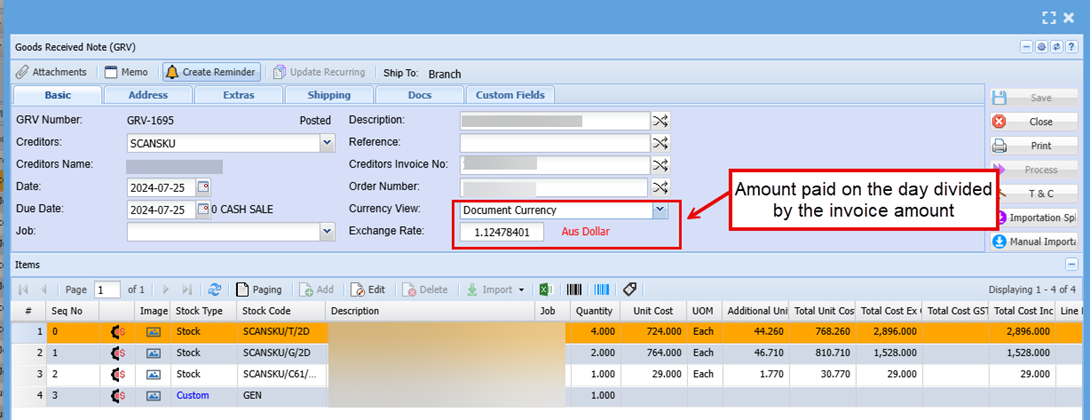 Before processing the GRV we would recommend updating the Exchange rate to reflect what it was the day payment was made to the supplier, this will save you having to do another entry later to offset the difference.