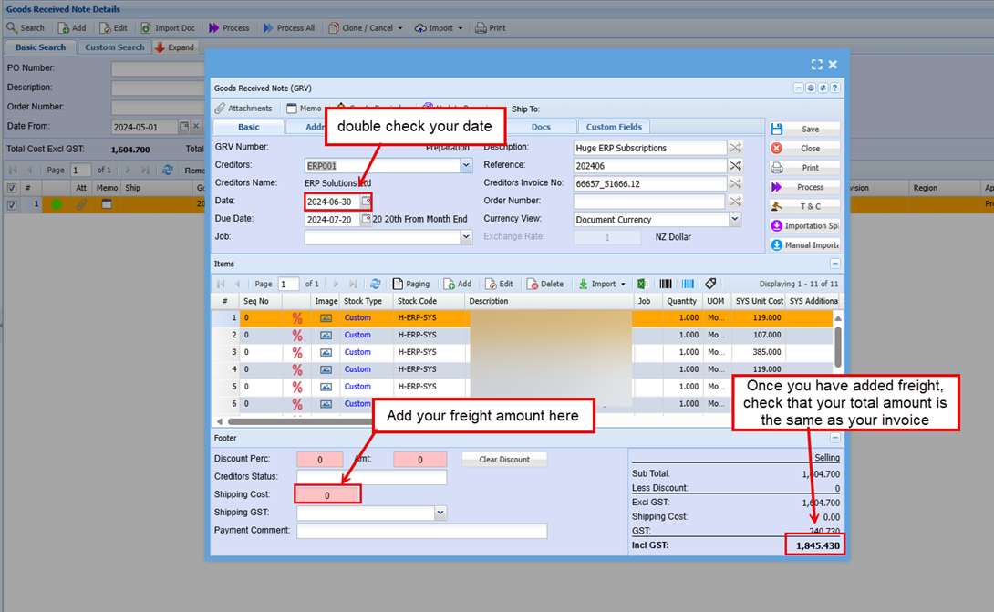 Go to the Goods Received Note tab under activity: Double click on the PO you are bringing in. To add the costs of freight to your landing costs you need to add the freight amount at the bottom of the Footer section, as per the screen below, or you can add this as a separate Creditors Shipping line item when you do the importation split.