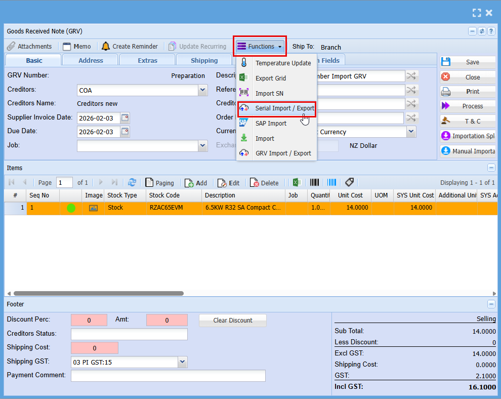 Serial Number Import (GRV)