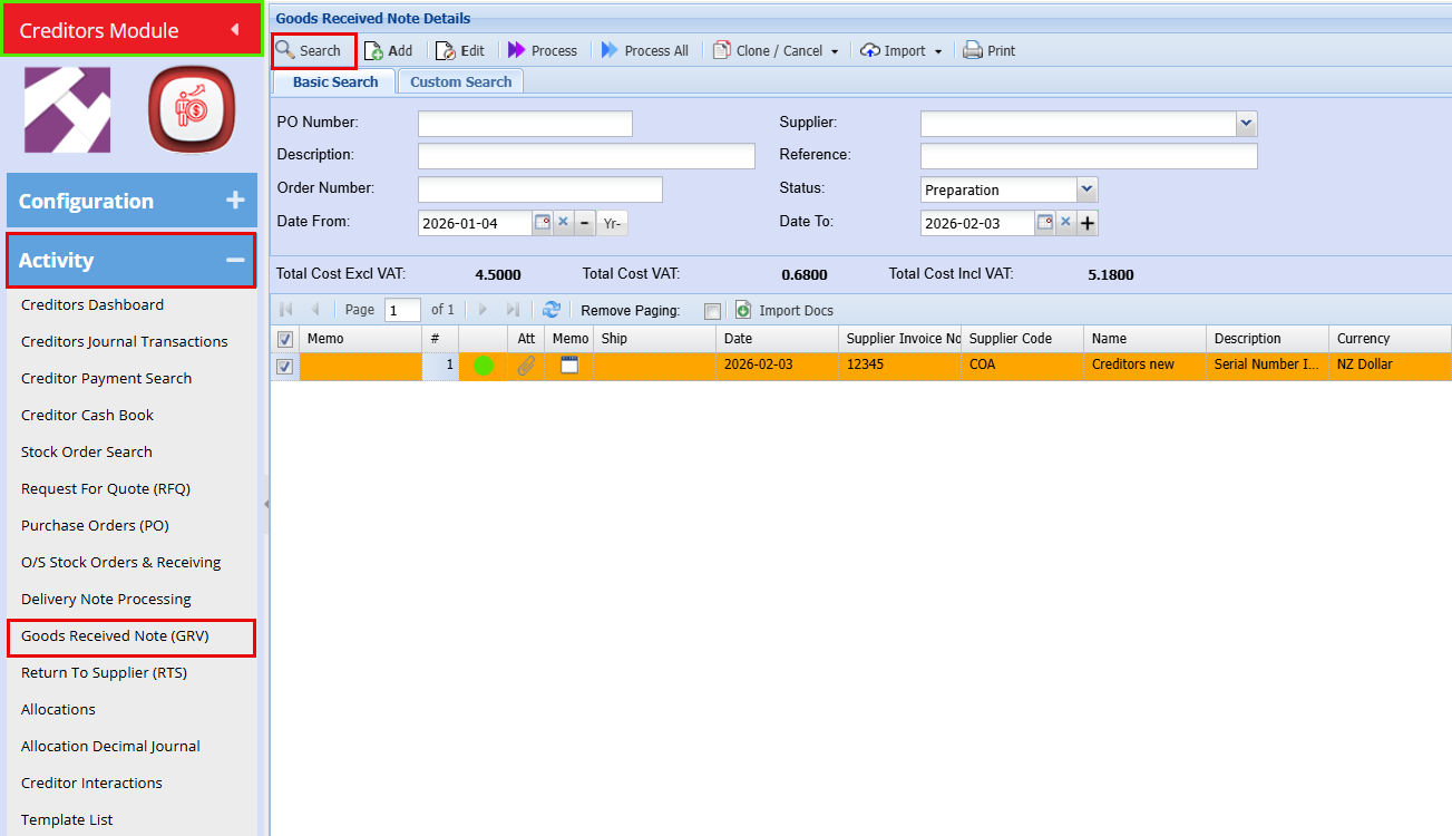 Creditors Module > Activity > Goods Received Note (GRV)