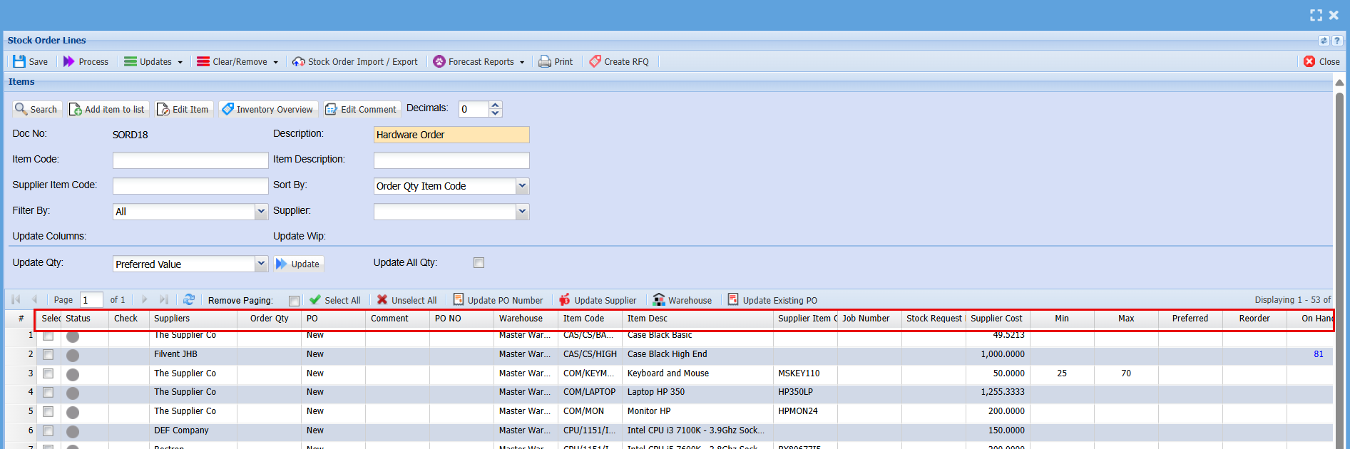 | PO | All purchase orders will show as new when a Stock order is created. If there is already a purchase order created for a supplier, and you just want to add this item to the existing purchase order by ticking the select box for this line and clicking the "Update Existing PO" Button. This will change the PO from New to Existing. |