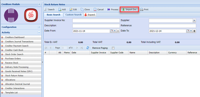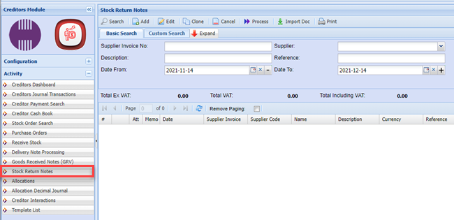 Creditors >Activity >Stock Return Note