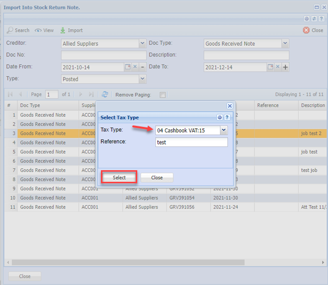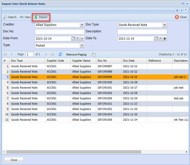 Select the GRV from the list and click on Import button