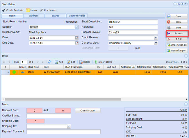 The Stock return note can now be processed.
