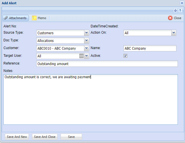 Alerts allow an automatic pop pop-up to occur when selecting a specific customer, supplier, stock item and other sections within the system.