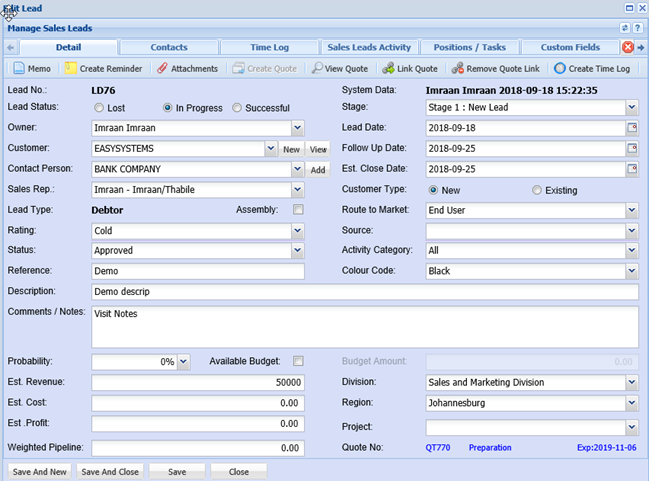 The system allows for a creation of a quote from the sales leads
